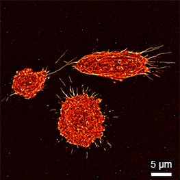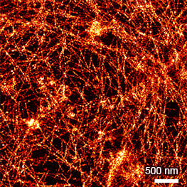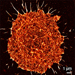 Super-resolution PAINT microscopy of fixed B cells in the µ-Slide VI 0.5 Glass Bottom, using a TIRF microscope. LifeAct-Cy3B was used to visualize the F-actin cytoskeleton. Objective lens: Nikon CFI SR HP Apochromat TIRF 100x Oil immersion, NA=1.49. Courtesy of Massive Photonics GmbH (www.massive-photonics.com).