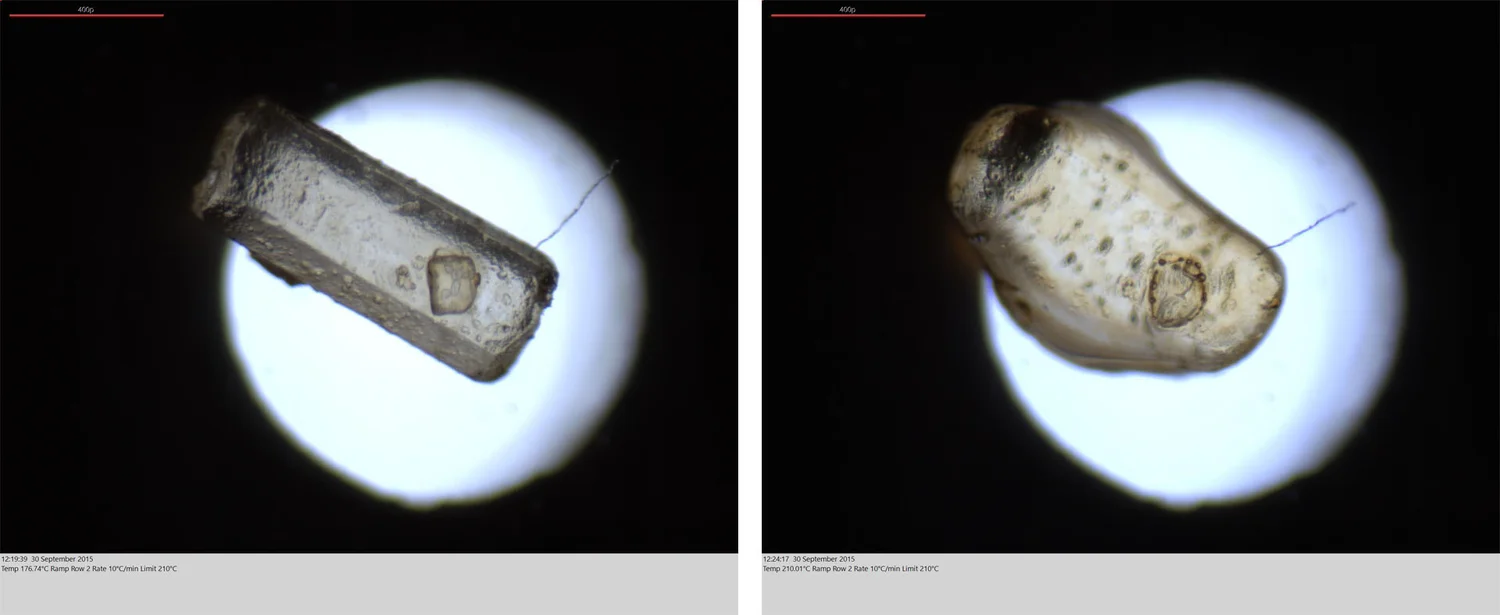 Above is a typical DSC curve output from the LINK control software. Below are images of a sucrose grain prior to melting (left) and during melting (right). The optical feature of the DSC system allows both data and image sampling throughout the experiment.